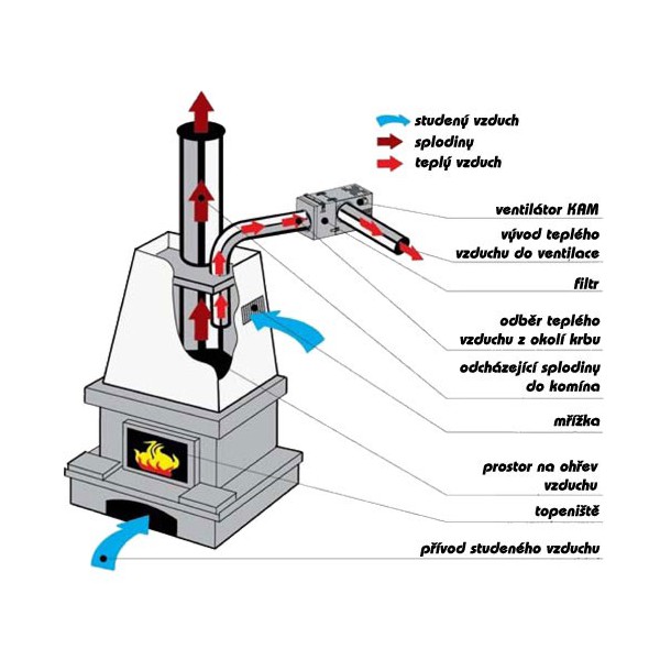 Ventilátor je určený na rozvod teplého vzduchu nad ohniskom krbu do obytných miestností. Je vybavený tepelne a akusticky izolovaným ventilátorom vháňajúcim vzduch. Ventilátor je vybavený termostatom, ktorý pri zistení Vami nastavenej teploty vzduchu ventilátor samočinne zapne (rozpätie teploty 0 ° C - 90 ° C). Pri ukončení kúrenia (už neprichádza teplý vzduch) sa ventilátor zase sám vypne. Tento termostat je regulovateľný, tzn. možno nastaviť teplotu, pri ktorej sa má ventilátor zapínať / vypínať.